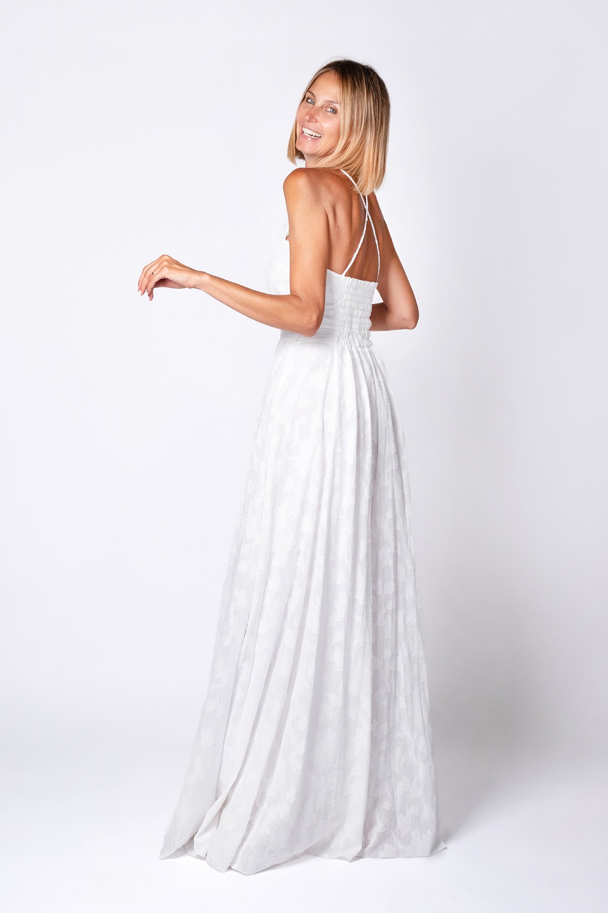 Abito bustier in 100% cotone, con disegno jacquard tono su tono. Spalline sottili intrecciate, ampia gonna che accompagna il movimento con leggerezza.