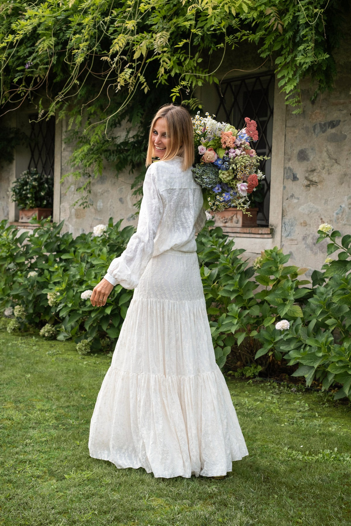 Gonna in seta e cotone a balze, con comodo elastico in vita.