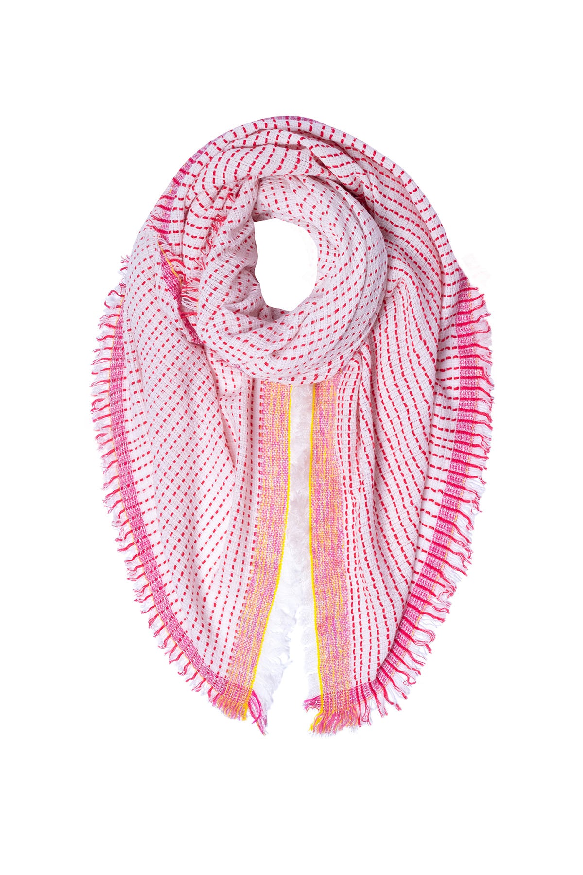Sciarpa a telaio macro fantasia con frange sui lati e cimossa a contrasto.