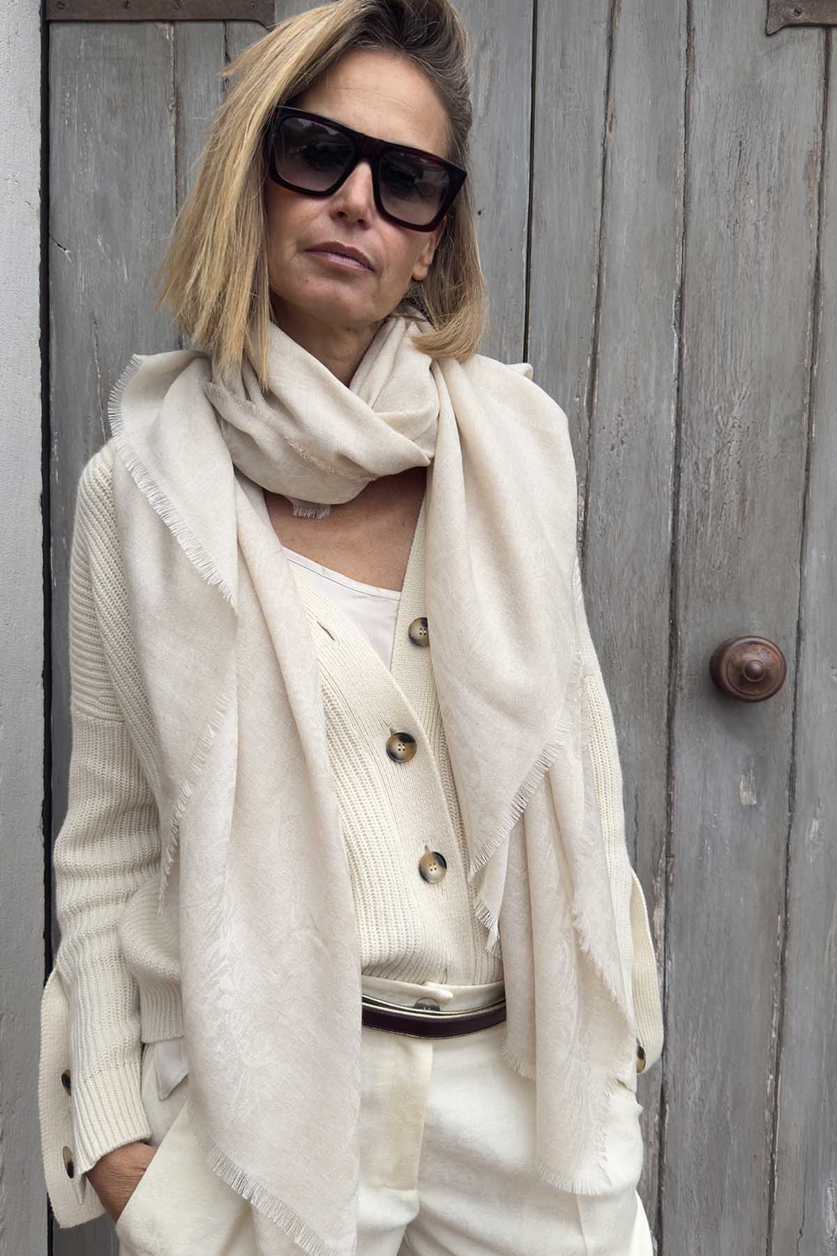 Schal aus einer edlen Mischung aus Kaschmir und Wolle, veredelt durch ein Jacquard-Muster in Ton-in-Ton, das einen zarten Relief-Effekt erzeugt. Leicht, aber voluminös, streichelt er die Haut... ein Hauch von Raffinesse in seiner reinsten Form.