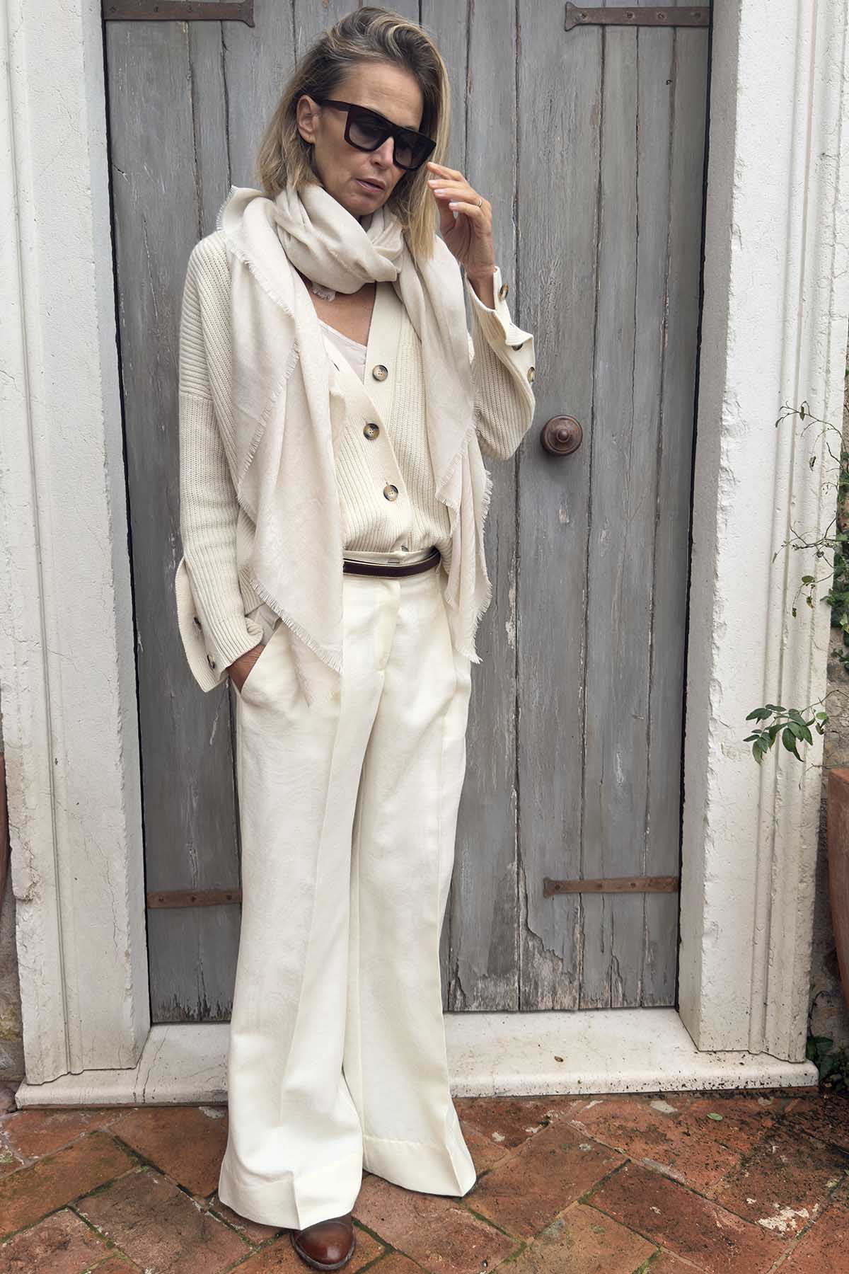 Schal aus einer edlen Mischung aus Kaschmir und Wolle, veredelt mit einem Ton-in-Ton-Jacquard-Muster, das einen zarten Relief-Effekt erzeugt. Leicht, aber voluminös, streichelt er die Haut... ein Hauch von Raffinesse in seiner reinsten Form.