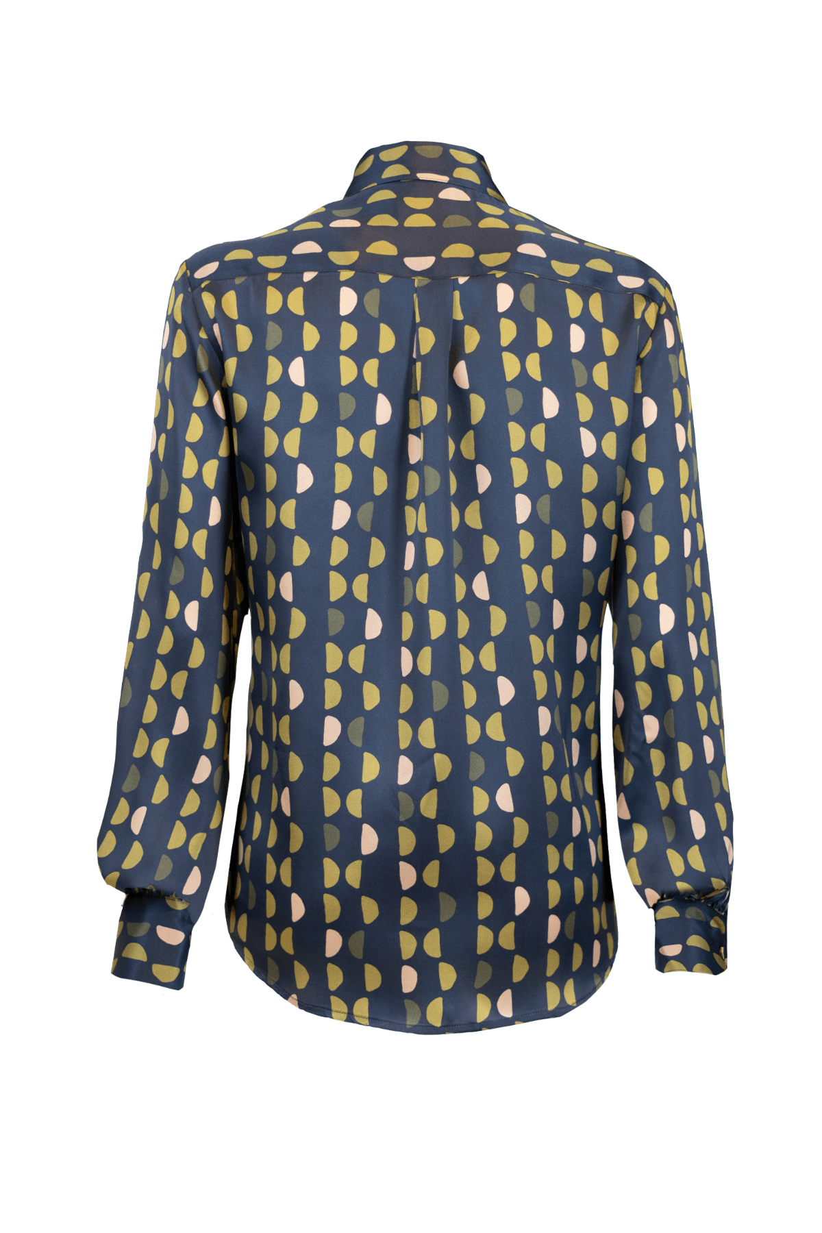 Feminine and sophisticated, this pure silk printed shirt features a soft line, slightly gathered sleeves, and an elegant Italian collar.
