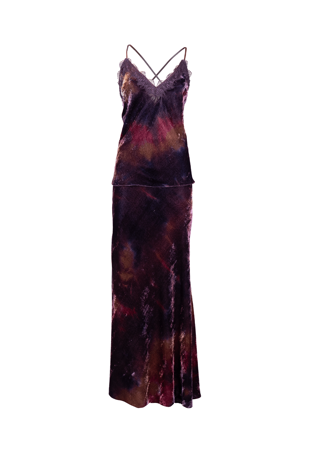 Light, fluid, and full of charm. This bias-cut skirt embraces the silhouette naturally, while the degradé velvet creates elegant plays of light and shades with every movement. A piece that combines comfort and refinement.
