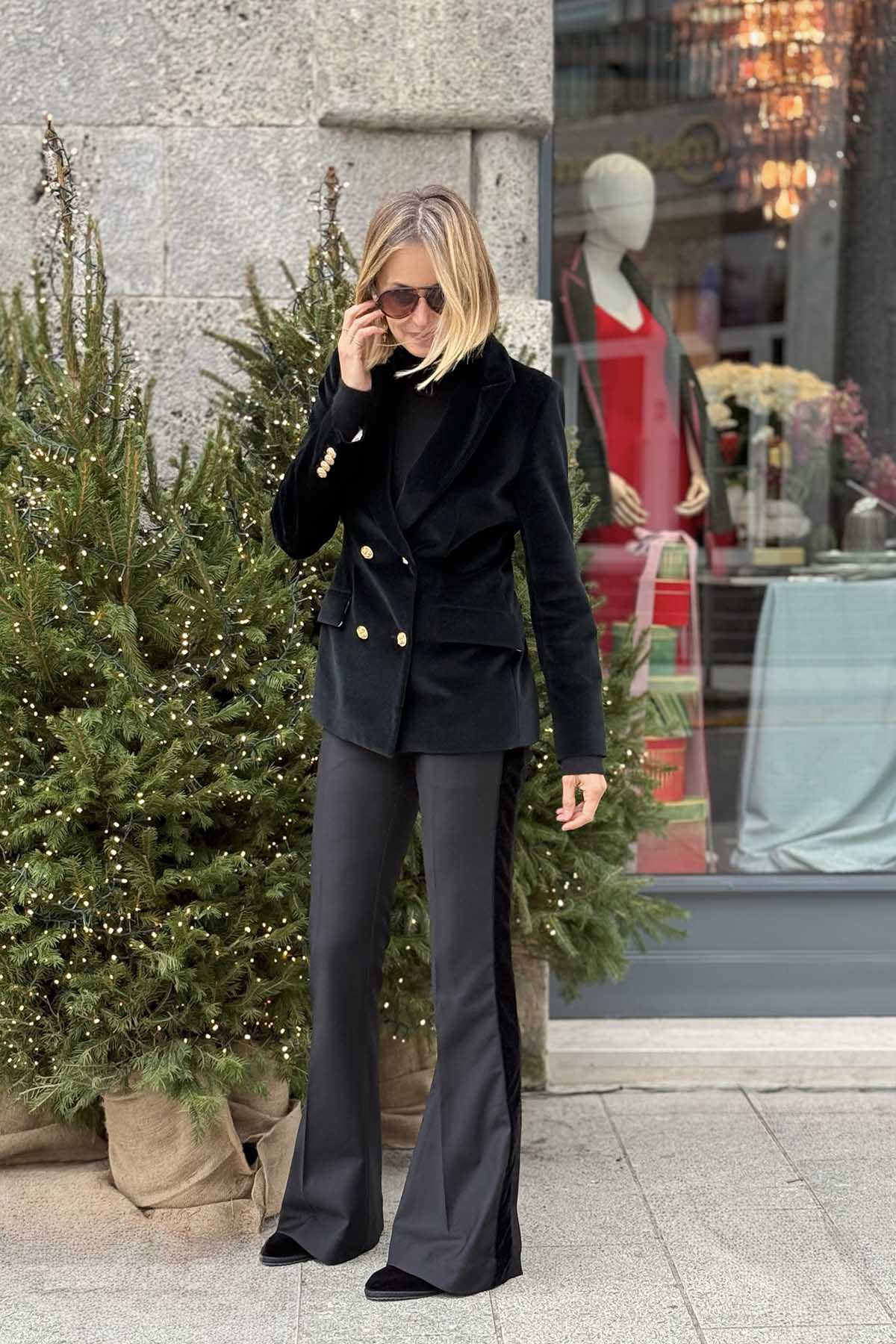 Il pantalone a zampa in fresco lana stretch esalta la silhouette con morbidezza e carattere. La linea slanciata si unisce alla texture della banda laterale in velluto per un effetto raffinato e deciso. Perfetto da solo o in coordinato con la giacca, per uno stile che racconta personalità e femminilità in ogni dettaglio. 98%WO 2%EA